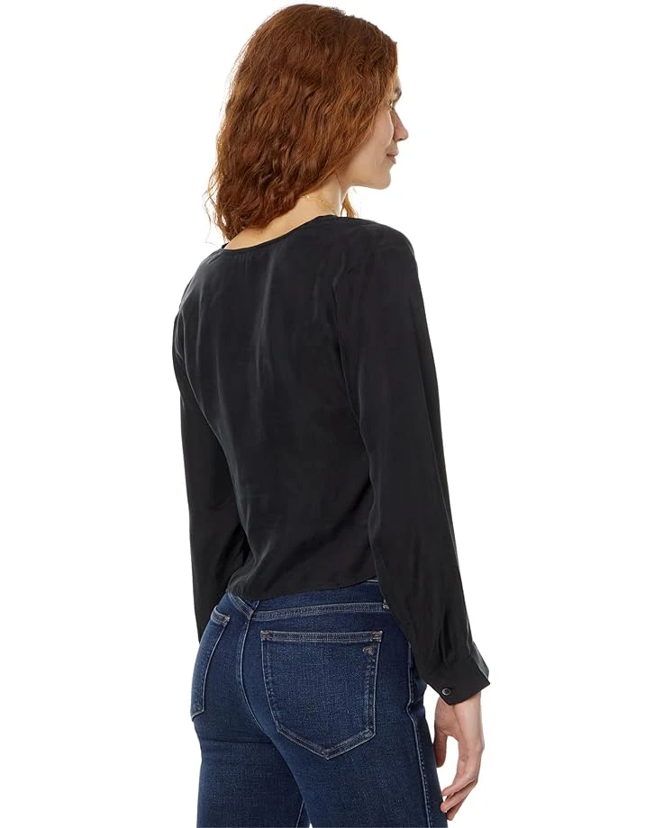- Long sleeves with buttoned cuffs and a V-neckline.