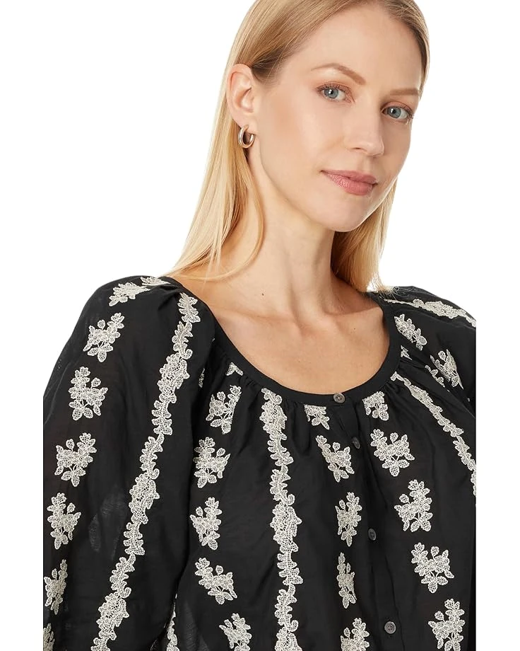 - Step out in effortless style in the Madewell® Embroidered Emilina Top – 3/4 Sleeve. Featuring a round neckline, long puff sleeves, front button closure, button-closure cuffs, and linear embroidery throughout.