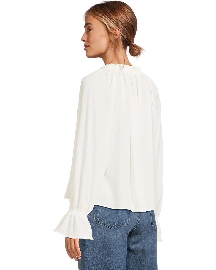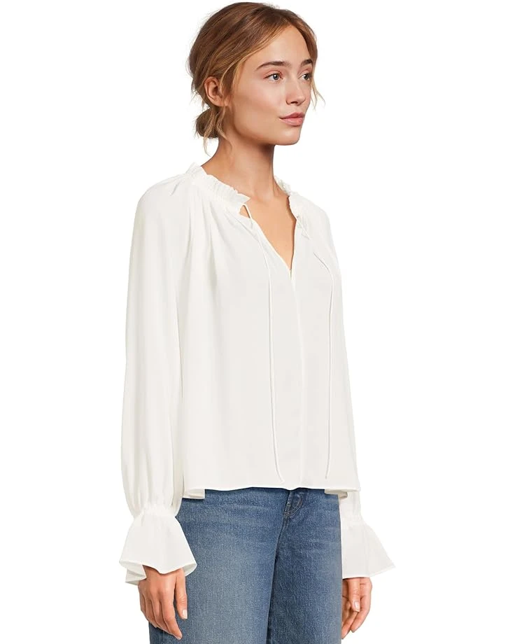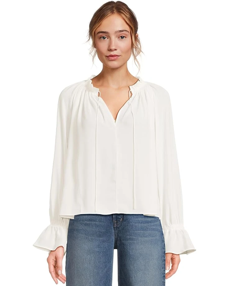 - Lightweight and easy on the body, this semisheer top has a ruffled neckline that you can leave undone or loosely tied. It’s supercute when tucked into high-rise jeans.
