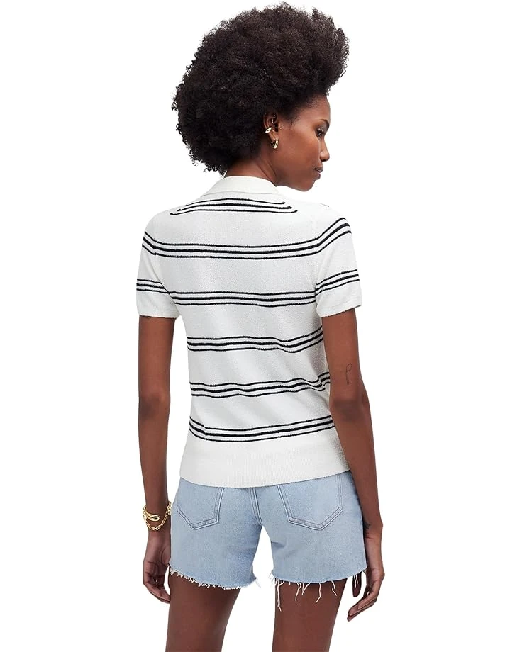 - Bring that timeless appeal to your styling game by complementing the Madewell® Polo Sweater Tee in Stripe with a classic denim jeans. The sweater tee features a regular boxy fit, collared neck, button-front closure, short sleeves, straight hem, and a striped pattern for an exquisite statment look.