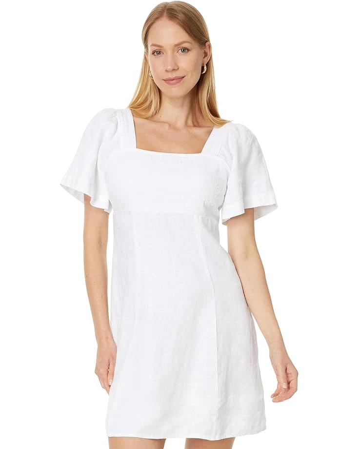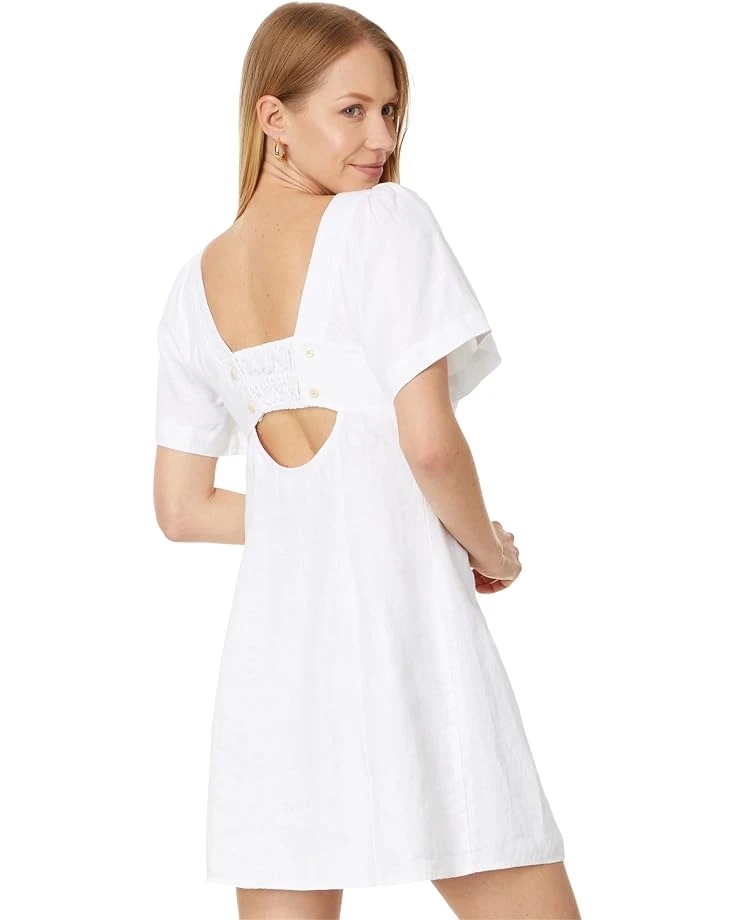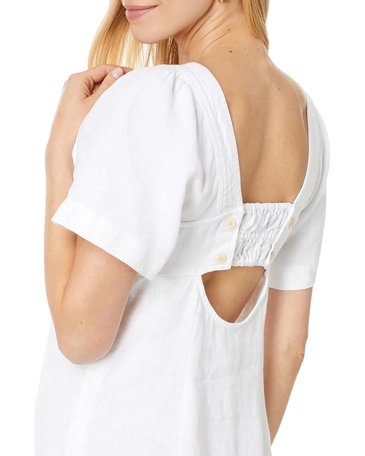 - Set into the symphony of glamorous charm wearing Madewell® Square-Neck Mini Dress in 100% Linen. It features a square neckline, short sleeves, and wide elasticized band at the back with buttoned accent and cutout detail.