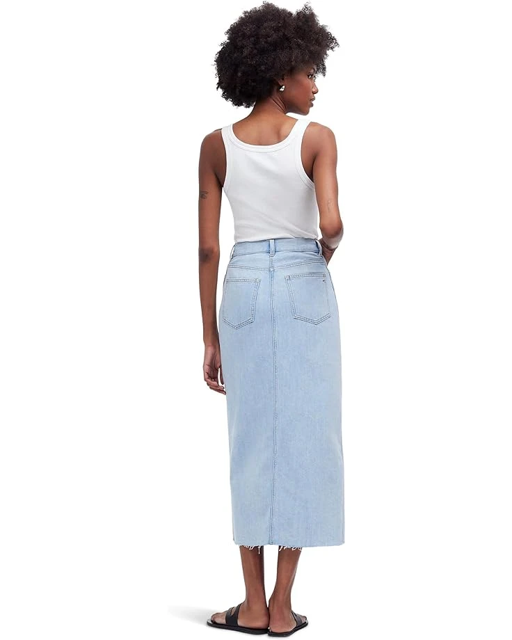 - Unleash your denim dreams wearing Madewell® The Rilee Denim Midi Skirt in Fitzgerald Wash! Effortlessly chic with a mid-slit cut and maxi length, it’s your go-to for style and comfort. Featuring a zip-fly with button closure and four pockets, it blends convenience with elegance. The mid-rise and belt loops ensure a perfect fit, making every stride a statement.