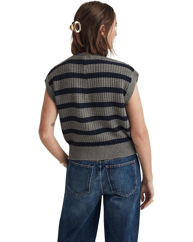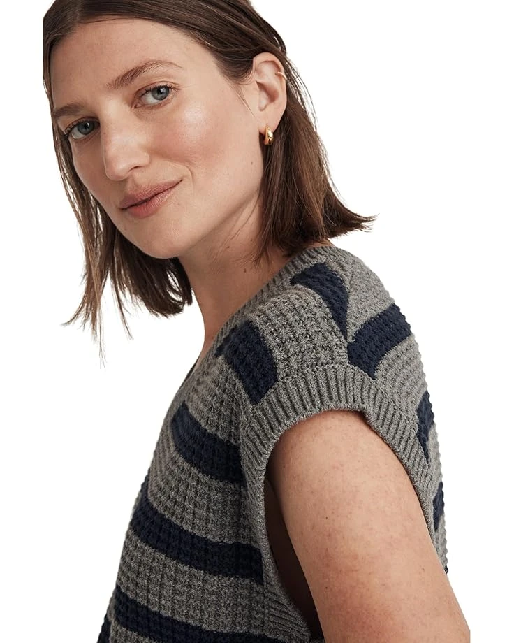 - Embrace the knitted bliss wearing the Madewell® Waffle-Knit Sweater Vest in Stripe. This relaxed fit striped waffle-knit sweater vest features cap sleeves, ribbed trim V-neckline. It is designed to hit above the high.
